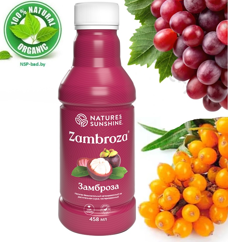 В результате появился напиток Замброза – продукт не только с отличным вкусом, но и обладающий невероятной способностью нейтрализовать свободные радикалы в организме человека. В напиток входят высококонцентрированные соки экзотических фруктов и всем известных ягод, представляя собой абсолютно натуральный продукт, не содержащий искусственных красителей, консервантов и ароматических средств. В его состав входят следующие компоненты: Виноград культурный (Vitis vinifera) – кустарник, ягоды которого содержат 10-30% сахаров, органические кислоты, гликозиды, полифенолы (антоцианы, протоантоцианидины), витамины. Обладает как общеукрепляющим, так и мочегонным и желчегонным свойствами.